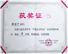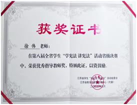 第八届江苏省学生“学宪法讲宪法”活动省级决赛暨“法治第二课堂”特别活动于近日在南京审计大学举行。全省66所高校81名素养竞赛学生经过初赛的激烈角逐,20位同学脱颖而出参加省级决赛。在省级决赛中,我院22级法律系学生郭佳宁喜获一等奖,徐伟老师获优秀指导教师奖。