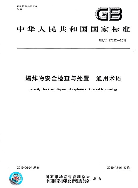 2015年7月31日,国家标准委“关于下达2015年第二批国家标准制修订计划的通知”(国标委综合〔2015〕52号),批准立项制定两项国家标准。两项国家标准负责起草单位为公安部第一研究所、江苏警官学院,参加起草单位有陆军工程大学等。《GB/T 37524-2019爆炸物现场处置规范》规范了疑有爆炸物现场、疑似爆炸物现场、持爆威胁现场、爆炸现场和废弃爆炸物现场等五类涉爆现场的处置原则、处置流程及措施要求。《GB/T 37522-2019爆炸物安全检查与处置通用术语》规范定义了防爆安检领域中的基础术语、爆炸物、防爆安检器材、排爆器材、爆炸防护装备等相关专业术语。