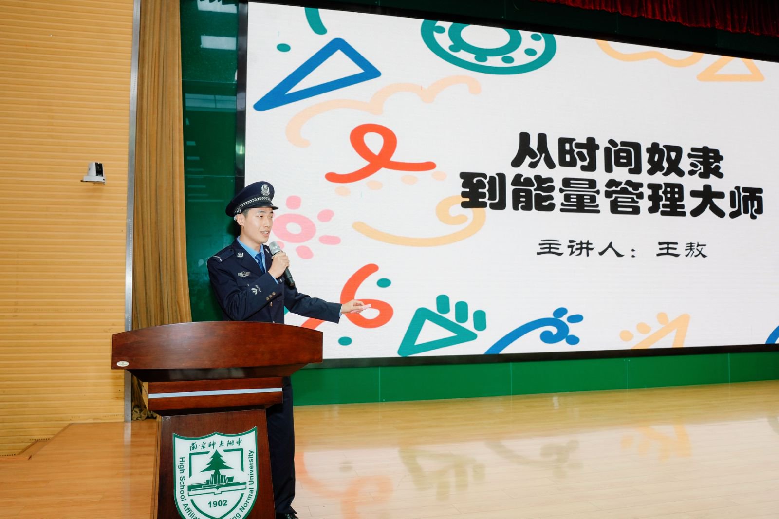 2025年9月26日,为迎接新中国成立76周年,深入贯彻落实江苏省公安厅“苏警安新”未成年人安全守护工程,“阳光下的蓝丝带”江苏警官学院宣讲团走进南京师范大学附属中学新城初级中学,为初二年级900余名同学开展“青春迎国庆 法治护成长”主题宣讲。本次活动旨在通过专业知识宣讲与大中学生互动,以“警察蓝”守护成长,用“法治伞”护航未来,让青少年在国庆氛围中感悟家国担当,在法治教育中筑牢安全防线,切实增强法治意识、安全意识和爱国情怀。