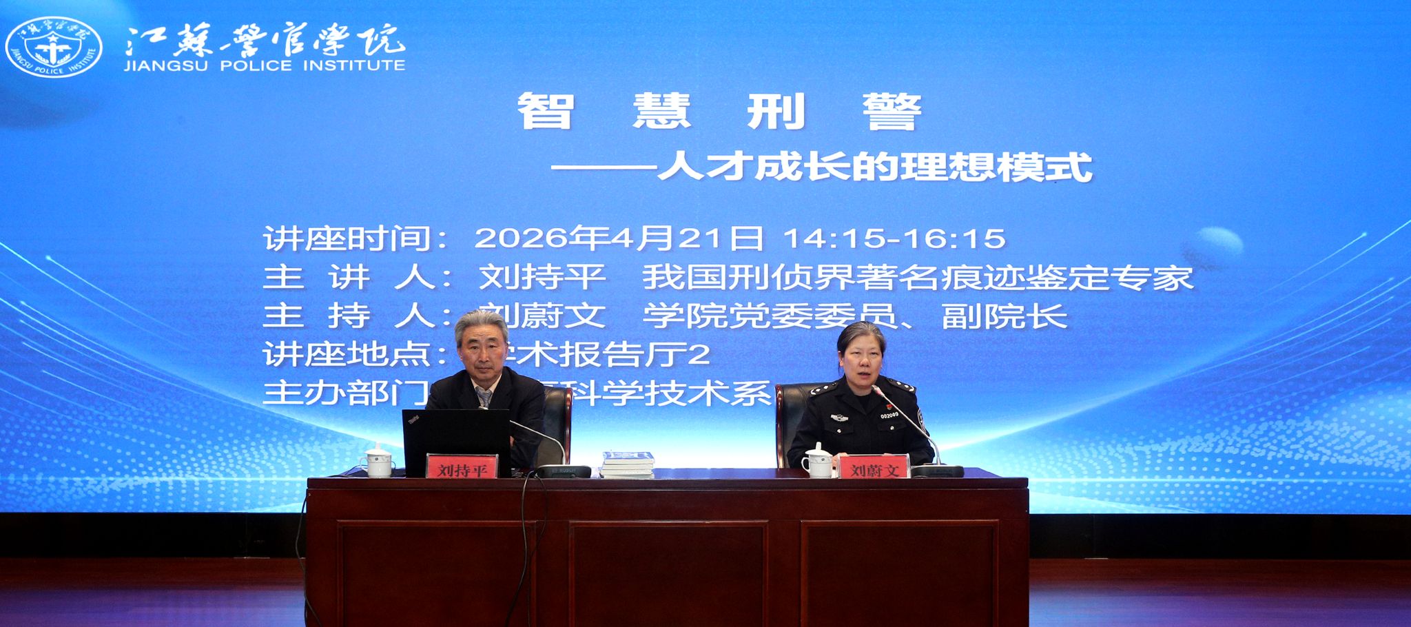 为筑牢青年学警从警根基,传承刑事技术工匠精神, 4月21日下午,刑事科学技术系特邀原常州市公安局党委副书记、副局长刘持平,开展“智慧刑警 —— 人才成长的理想模式” 专题讲座,刘蔚文副院长主持,2022级学生和部分教师代表参加。