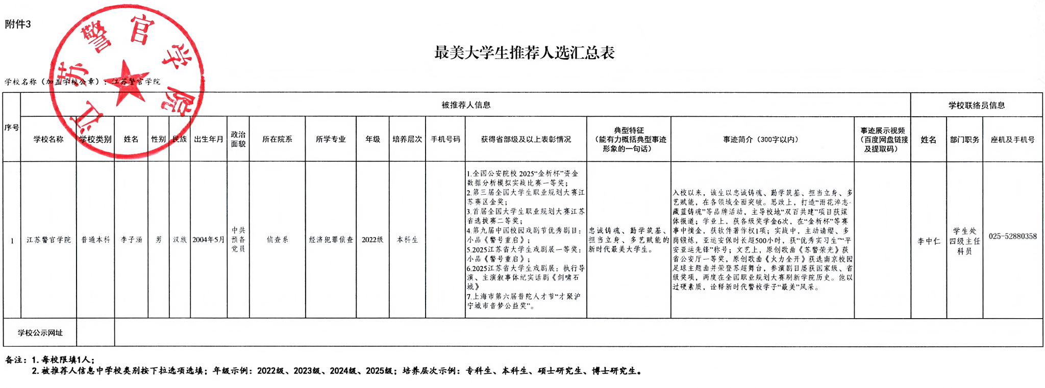 根据《省教育厅办公室关于转发教育部办公厅开展“最美高校辅导员”和“最美大学生”推选展示活动的通知》,经学生大队民主推荐、集体酝酿,学生处审核,校内外专家盲审,学生处党政联席会议研究并报校领导同意,拟确定李子涵同学为我校“最美大学生”推荐人选,上报省教育厅遴选,现予公示。